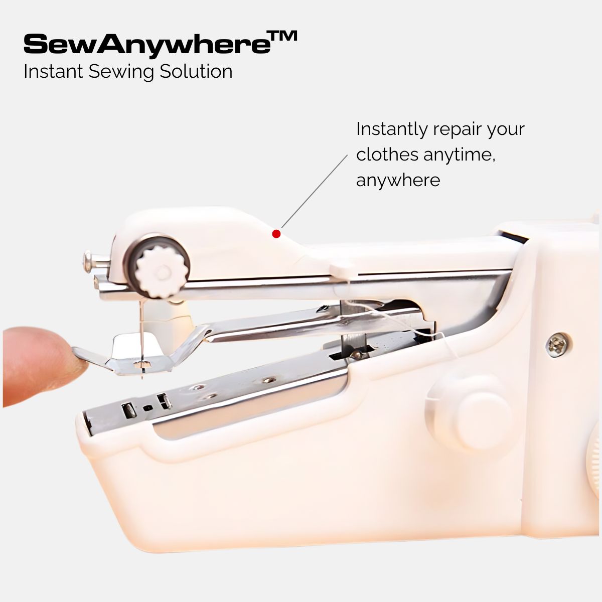 Designed for efficiency and ease of use, this compact sewing machine fits comfortably in your hand and can be carried anywhere, making it an essential companion for travel. The SewAnywhere™ Instant Sewing Solution is a lifesaver for those unexpected wardrobe malfunctions, allowing you to make repairs without removing your clothes.